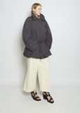 Lemaire double-breasted wadded coat with a round collar and removable tonal cotton belt, made in an asphalt grey washed cotton. Features concealed side seam pockets, saddle sleeves and large Corozo buttons.
