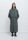 Lemaire classic single-breasted trench coat in deep forest green with low-set storm flaps at front and back in washed cotton. Features a side insert chest pocket and welt side pockets. Dropped shoulders. Adjustable belt detailing at sleeve cuffs. Finished with tonal buttons. Straight cut with an oversized fit.