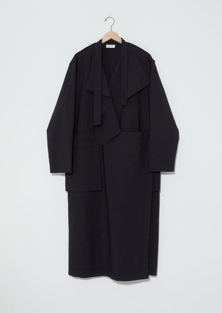 Lemaire signature cotton-blend trench dress with a draped handkerchief collar and asymmetrical front pockets with this season's panel overlay button closure at side. Loose patch pockets at hips with one hidden under overlay. Removable self belt to cinch at waist. Paneled construction at back. Unlined.