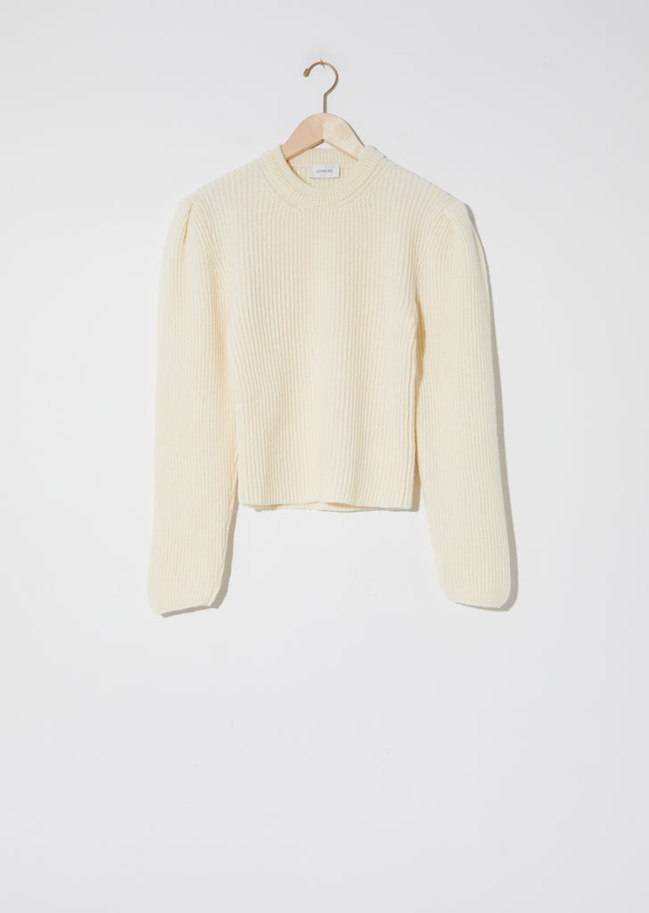 FW'20 Collection — Lemaire Puffy Sleeve Sweater in Chalk. Ivory-toned wool shetland ribbed crewneck sweater with signature wide sleeves accented with double-tucks on the shoulder.