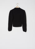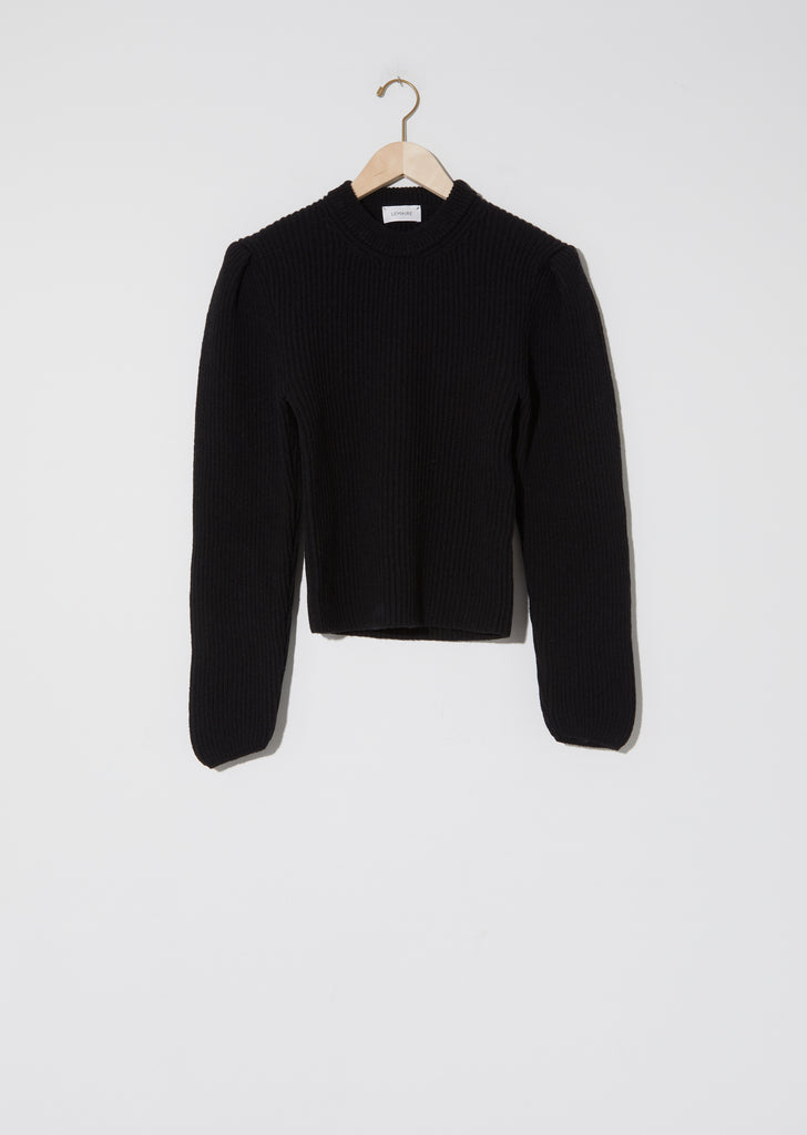 FW'20 Collection — Lemaire Puffy Sleeve Sweater in Black. Ivory-toned wool shetland ribbed crewneck sweater with signature wide sleeves accented with double-tucks on the shoulder.