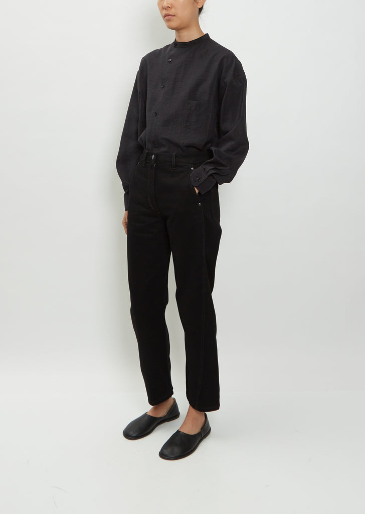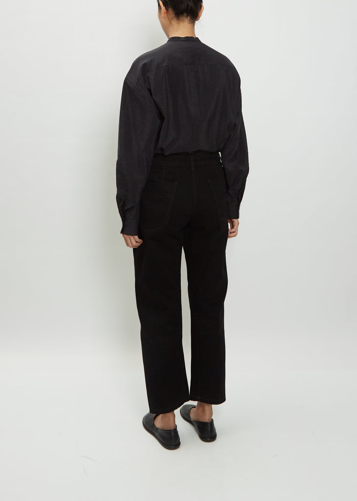 Lemaire black twisted seam straight leg denim pant with large back patch pockets in a rigid cotton denim.