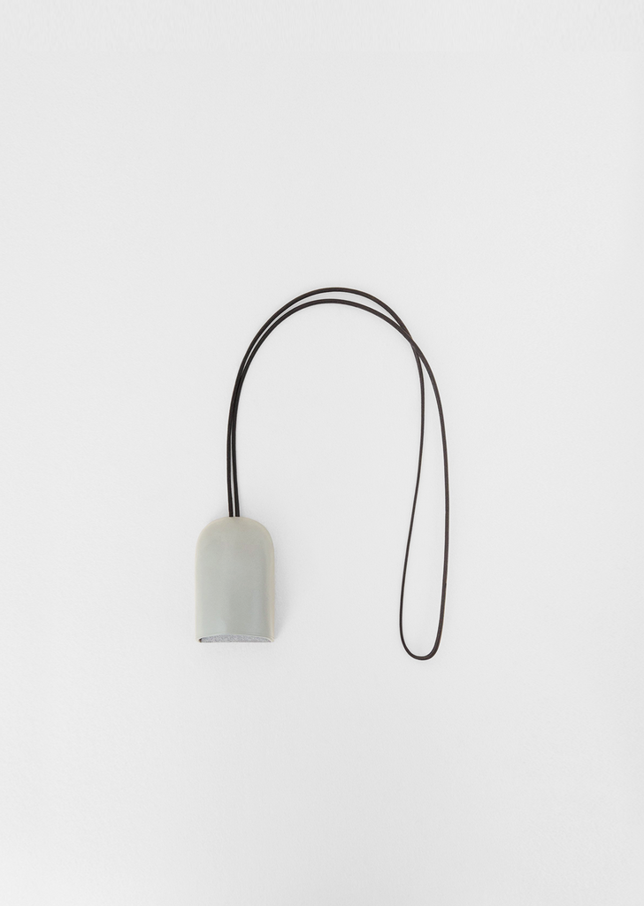 Lemaire molded bell shape key holder in smooth vegetable-tanned leather with a leather cord to wear around the neck. Seamless construction and unlined; each piece is waxed and polished by hand.