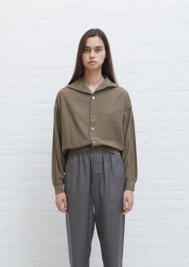Lemaire buttoned pullover sweater with high neck in mustard melange knit that can be worn on both sides with buttons lining the front or back. Neckline can be buttoned up to wear as a soft roll neck. Rib trim finish at sleeve cuffs and hem. Blouson silhouette with a relaxed fit.