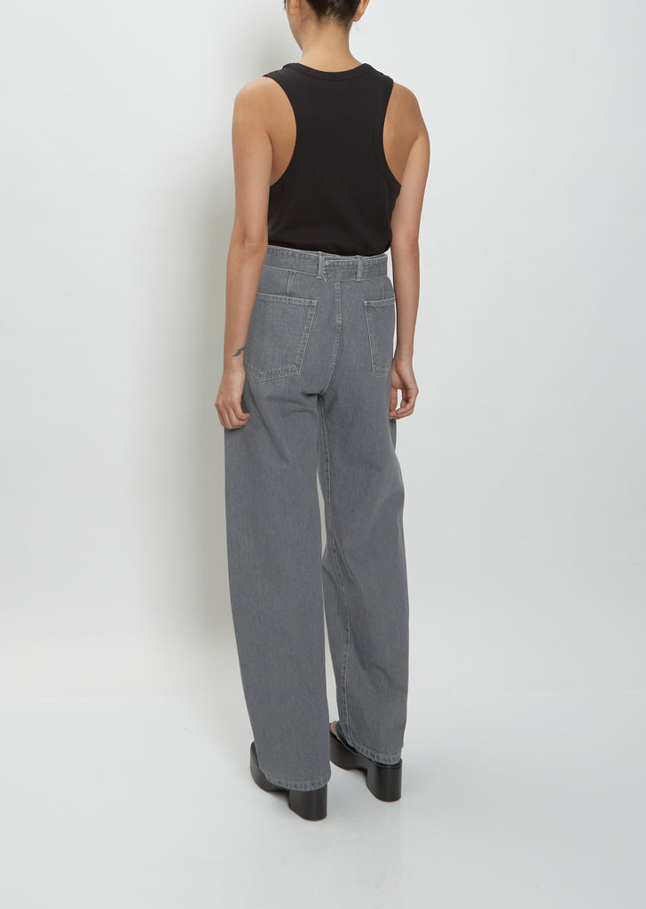 Lemaire unisex stone grey curved leg denim pants in a faded stone washed cotton rigid denim.  Details include two side pockets, back patch pockets and contrast stitching. The fit is elongated and mid-rise and includes a matching belt to adjust the waist.