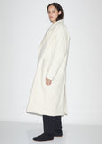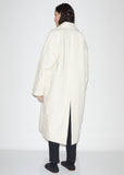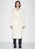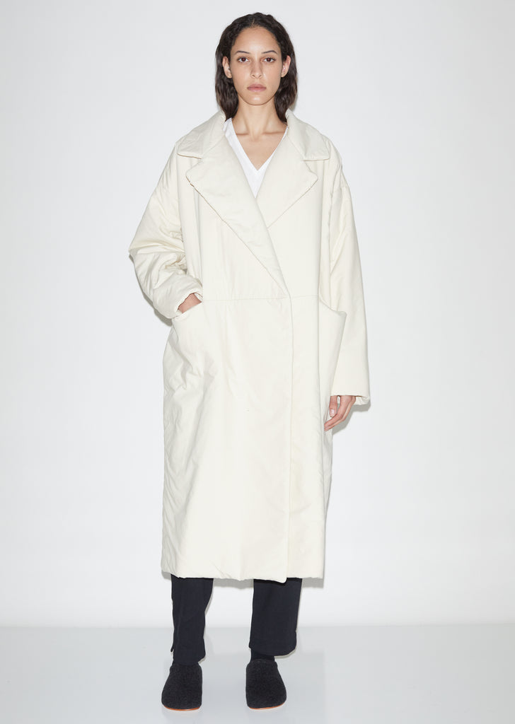 Muslin-tone belted trench coat in cotton broadcloth, lightly padded throughout for extra warmth.
