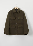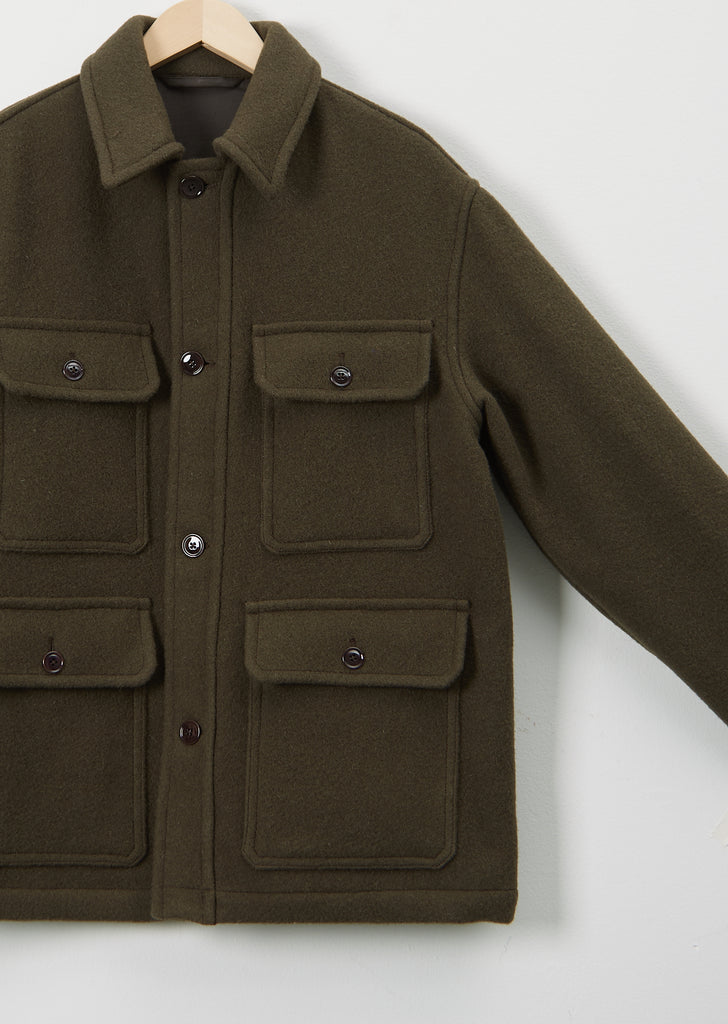 Lemaire Men hunting-inspired jacket made of a warm, heavy wool with a fuzzy texture. Boxy volume accented by a square hem and four buttoned patch pockets at front. Featuring a classic collar, straight cuffs and reinforcement stitching throughout.