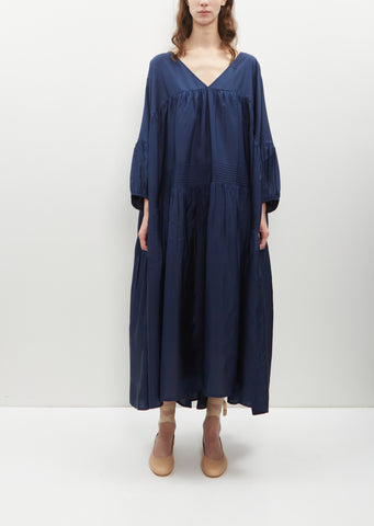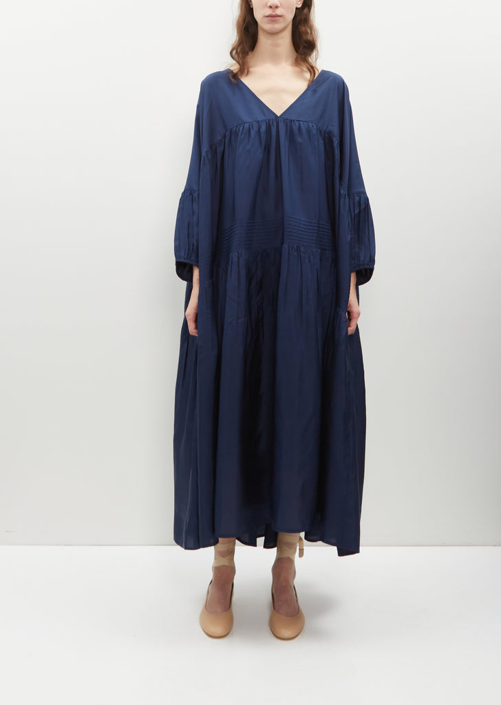 Anaak signature v-neck tiered maxi dress in eclipse blue silk habotai. Features horizontal pintuck detailing at the waist and shirred detailing at the sleeve. Pops over. Oversized fit.