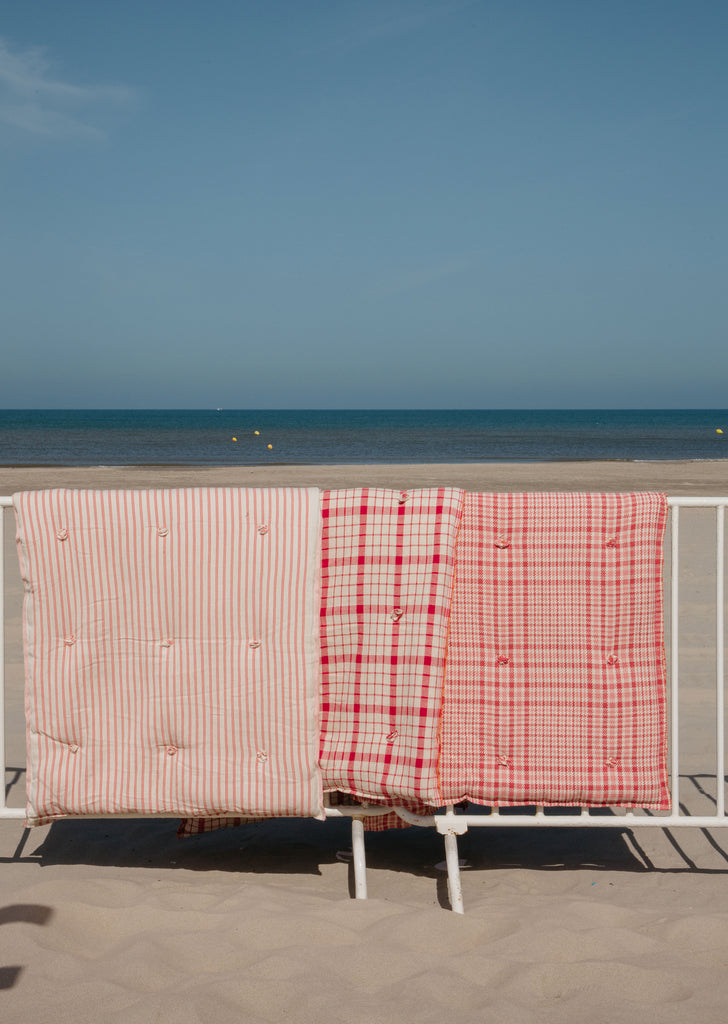 Moismont Cotton Check Futon in pink. Designed in France and crafted in India with 100% cotton cover, this padded futon in red, pink & ivory check has a rectangular shape with tuft detailing. Ideal for a variety of uses, we love it as a topper for sofas or beds.