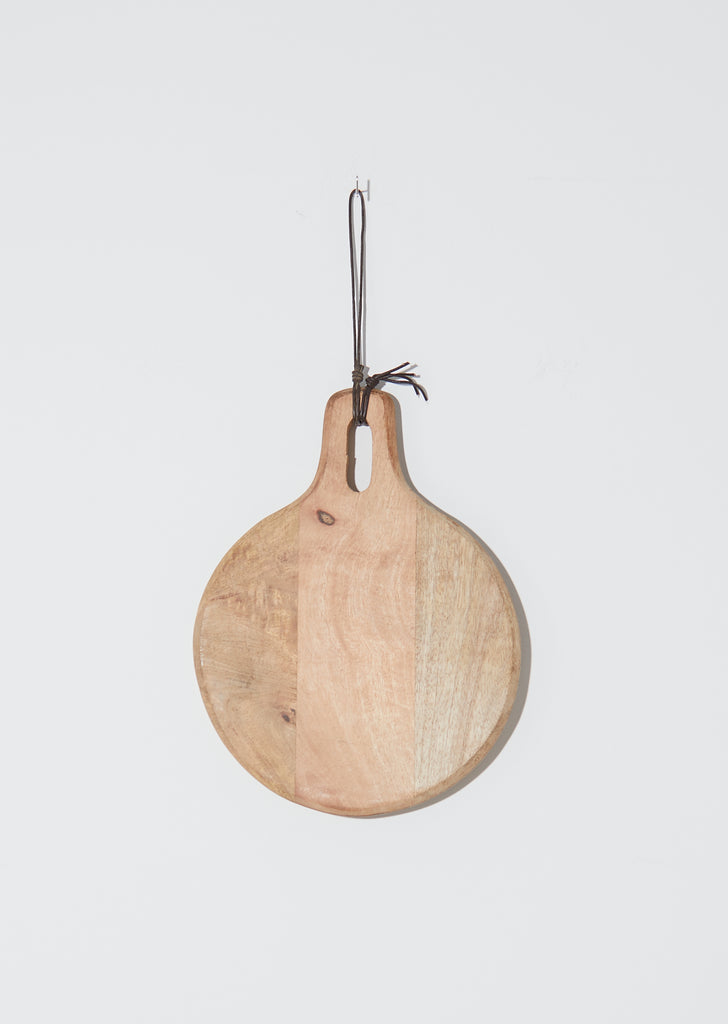 Circular cutting board in mango wood with brown leather circular strap for easy hanging. Can be used as a cutting board, serving, or displaying. From Holland, since 1898.