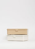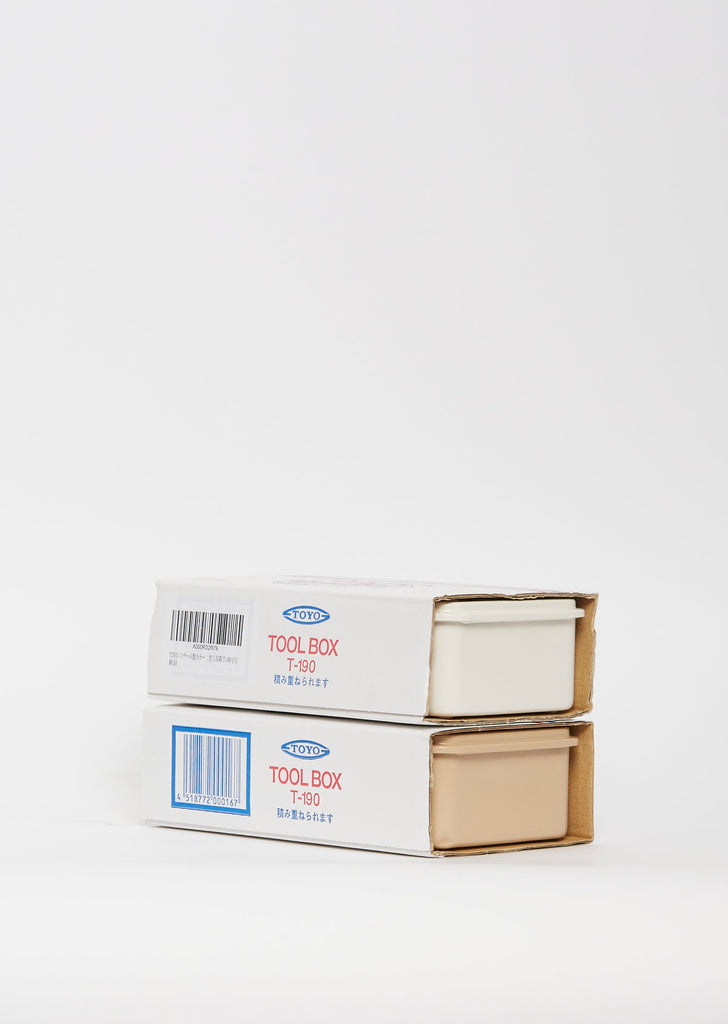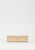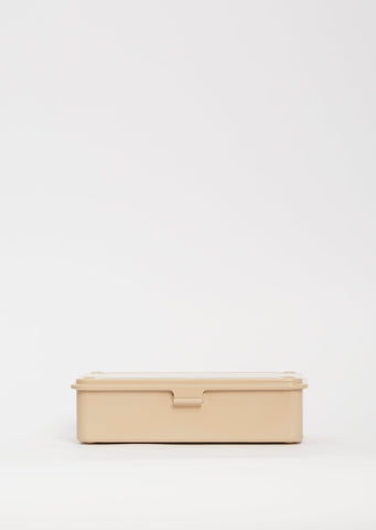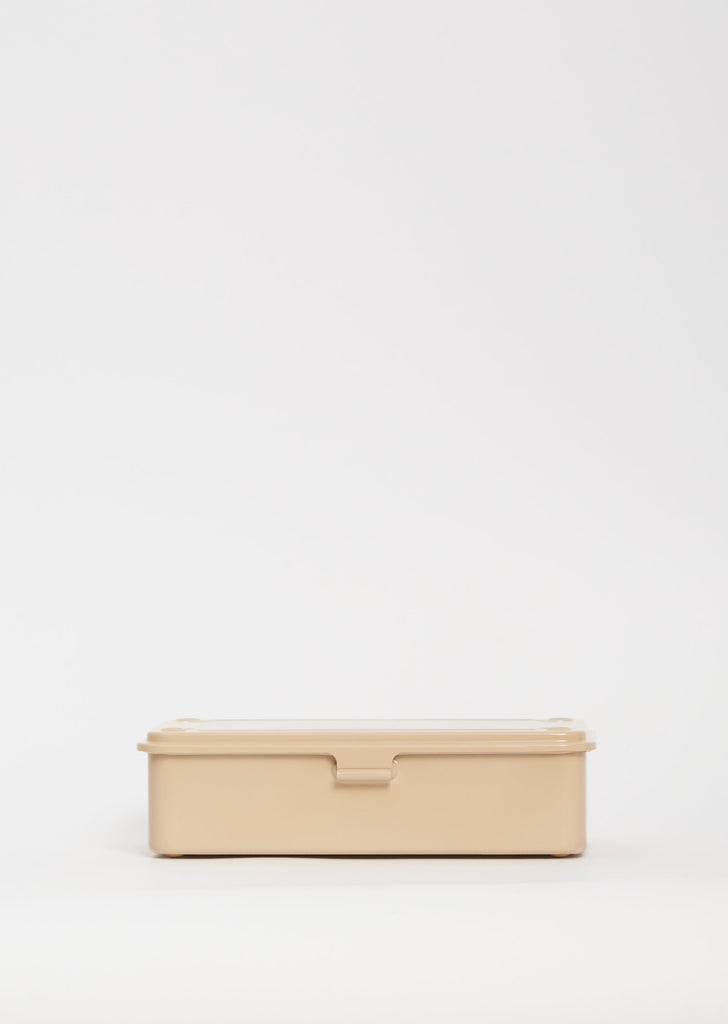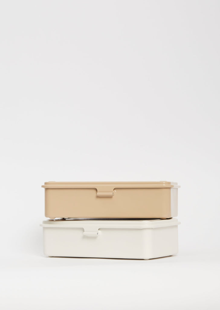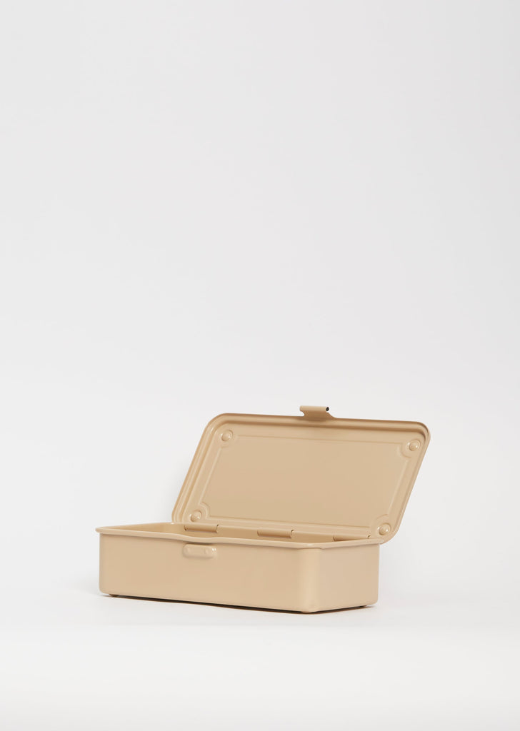 Toyo beige steel storage box with flat lid, made from one piece of steel, resulting in no sharp edges. Can be stacked securely due to the negative / positive imprints on the top and underside. Use for art supplies, make-up, nail polish, teas, travel documents - the possibilities are endless.