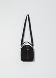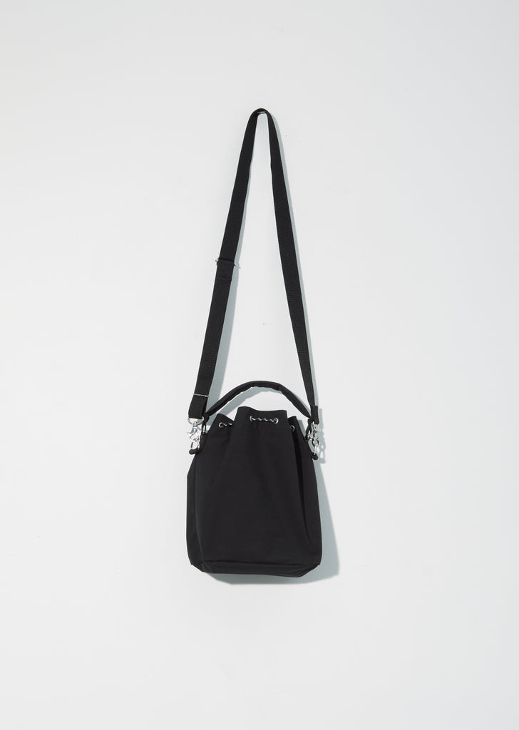 Danton black bucket bag with drawstring closure and additional top handle. Removable and adjustable webbing shoulder strap and top handle. Additional exterior pocket. Silver-tone hardware. Black & white rope drawstring detail.