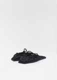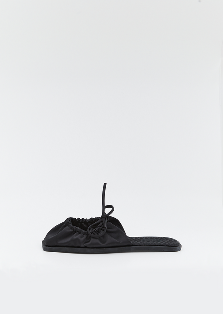 Black satin closed toe slides by Carlotha Ray sustainably crafted from environmentally-friendly satin on a compostable rubber sole. Colored using organic vegan dye for a naturally-derived charcoal shade, these square toe slides feature a drawstring keyhole fastening and a quilted footbed. The tie strap can be adjusted for customized comfort.