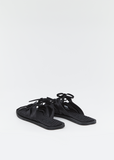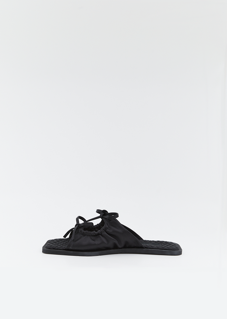 Black satin tie Adele sandals by Carlotha Ray sustainably crafted from environmentally-friendly satin on a compostable rubber sole. Colored using organic vegan dye for a naturally-derived charcoal shade, these square toe sandals feature a double drawstring fastening and a quilted footbed. The tie straps can be adjusted for customized comfort.