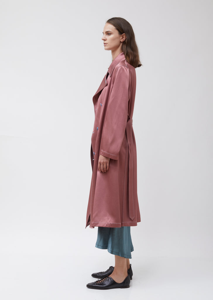 Double-breasted trenchcoat in blush-tone satin twill, finished with contrast light-blue top-stitching and buttons. Notch lapels; stitched buttonholes. Long sleeves. 6x3 double-breasted closure. Optional coordinating belt; polished gunmetal pin buckle and grommets; belt loops at back. Angled applied-welt side pockets. Center back vent. Straight midi hem. Unlined. Relaxed fit.