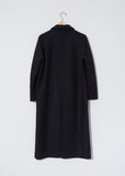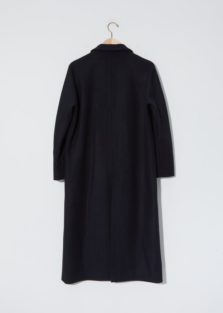 FW'20 Collection — Stephan Schneider Lexikon Coat in Night. Crafted of a wool blend, dark navy  Crombie-style coat with a convertible notch collar and hidden button placket. Backside features a high vent.