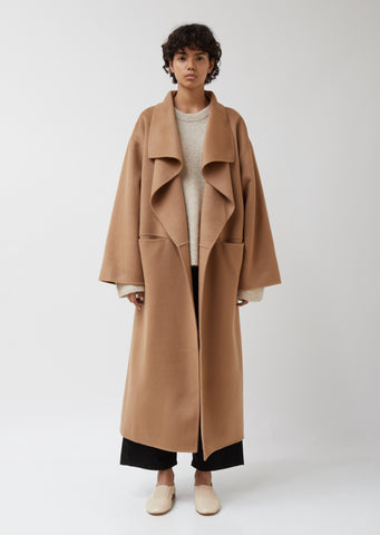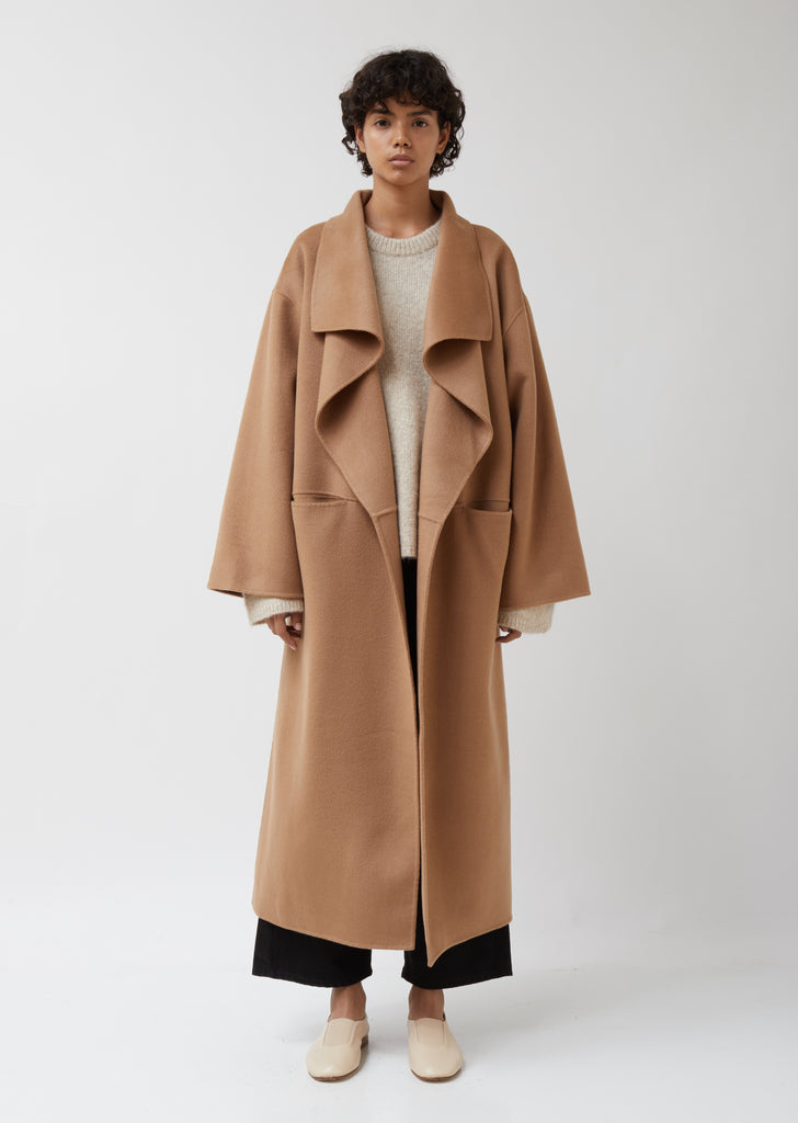 Oversized open-front midi coat crafted from camel-colored felted wool-cashmere. Wide, oversized lapels. Drop shoulders. Long wide sleeves. On-seam front pockets at natural waist. Side-seam slits. Straight, above-the-ankle hem. Generous fit.
