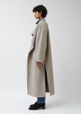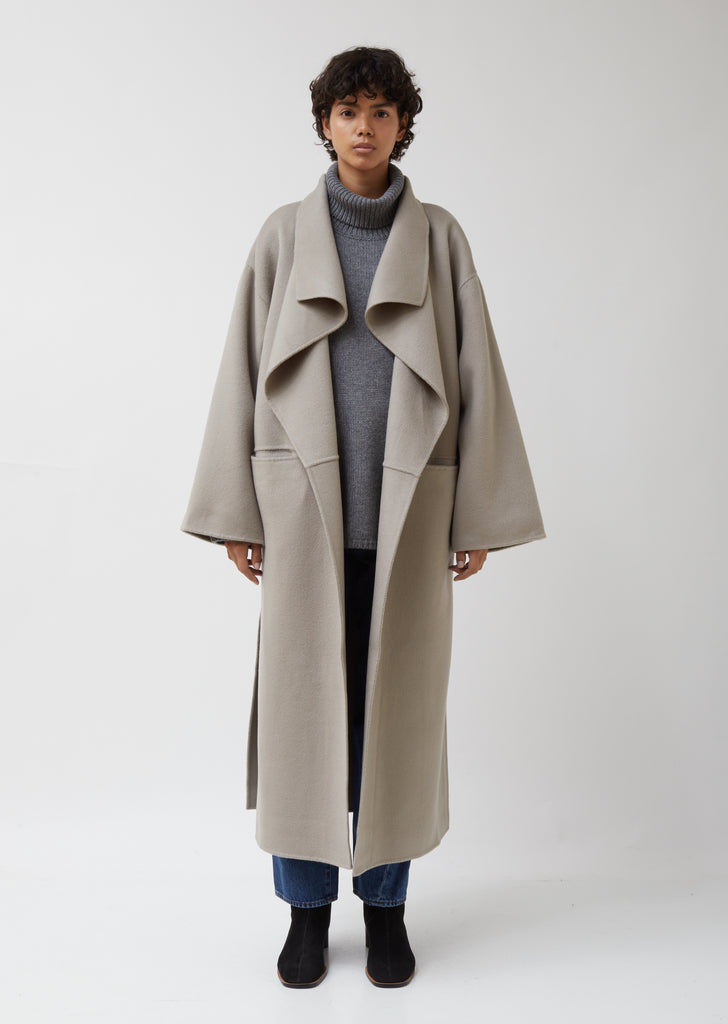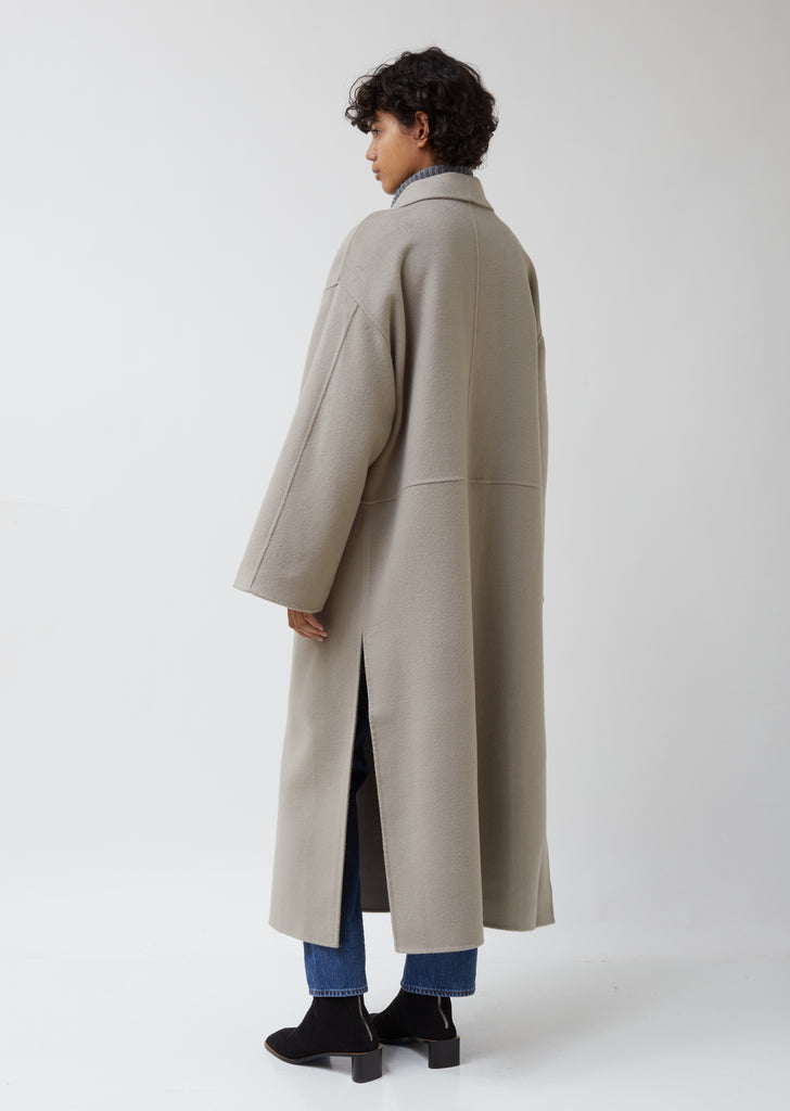 Oversized open-front midi coat crafted from elephant-grey felted wool-cashmere. Wide, oversized lapels. Drop shoulders. Long wide sleeves. On-seam front pockets at natural waist. Side-seam slits. Straight, above-the-ankle hem. Generous fit.