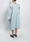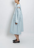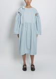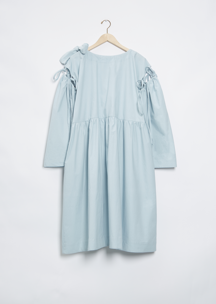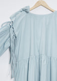 Cawley Studio sky blue oversized smock dress with self tied long sleeves in a mid-weight brushed cotton.