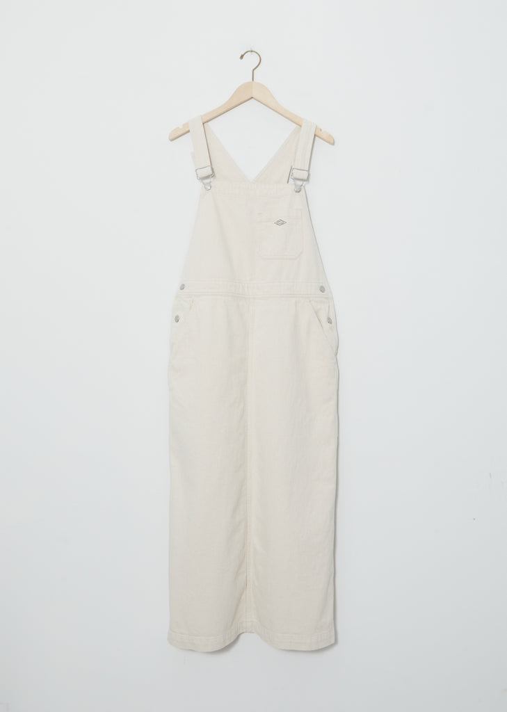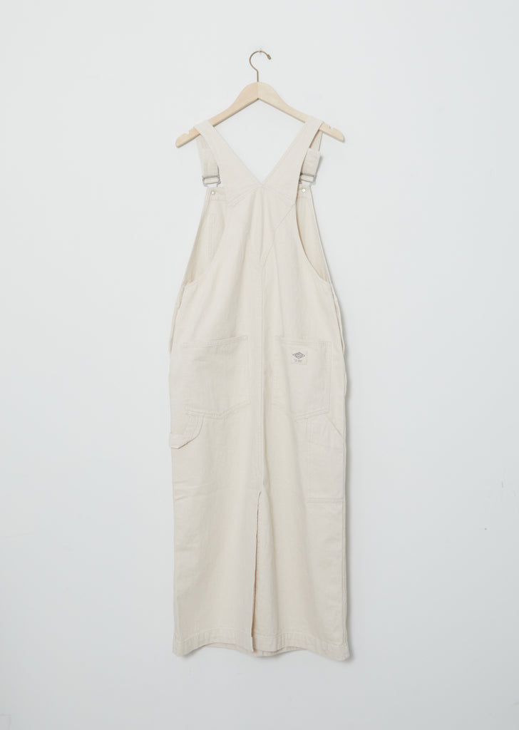 Danton signature overall in ecru-tone denim. Slant side pockets with small angled chest pocket. Silver-tone hardware and buttons on sides. Double patch pockets at back with longer side pocket below. High back vent. Relaxed fit.