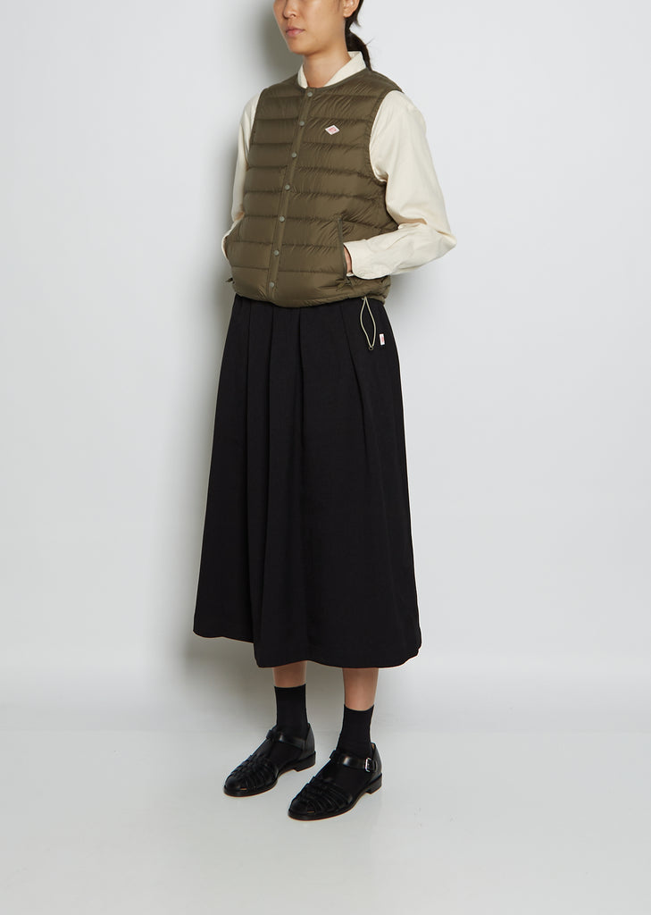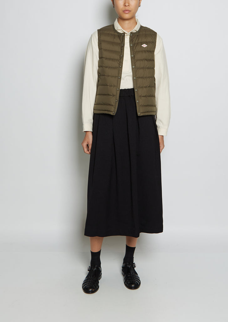 Danton crewneck puffer vest with embroidered Danton logo patch at chest in an olive green lightweight nylon filled with feather down. Features tonal snap closures, front zip pockets and a small travel pouch.