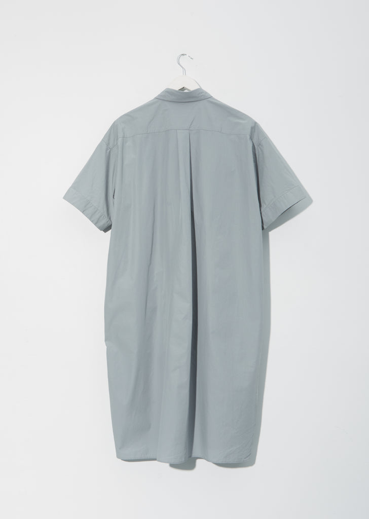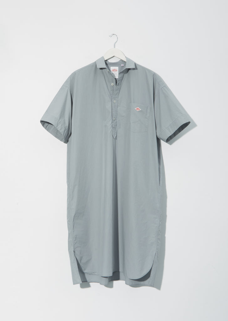 Spring-Summer '21 Collection — Danton shirtdress in cloud grey cotton poplin. Shirttail hem. Single chest pocket with embroidered Danton logo. Concealed side pockets. Unlined.