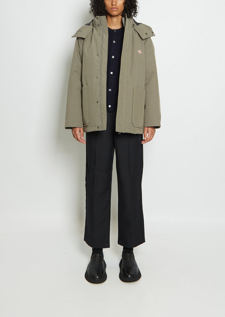 Color: Olive. 82% Polyester, 18% Cotton. Lining: 100% Polyester. Insulation: 80% Down, 20% Feather. Made in Japan.
