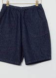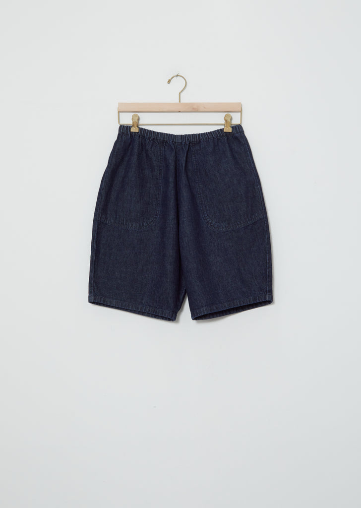 Danton bloomer shorts in dark indigo denim with elasticated waist. Concealed rounded patch pockets with side inserts, and single patch pocket at back with Danton embroidered logo. Relaxed fit.