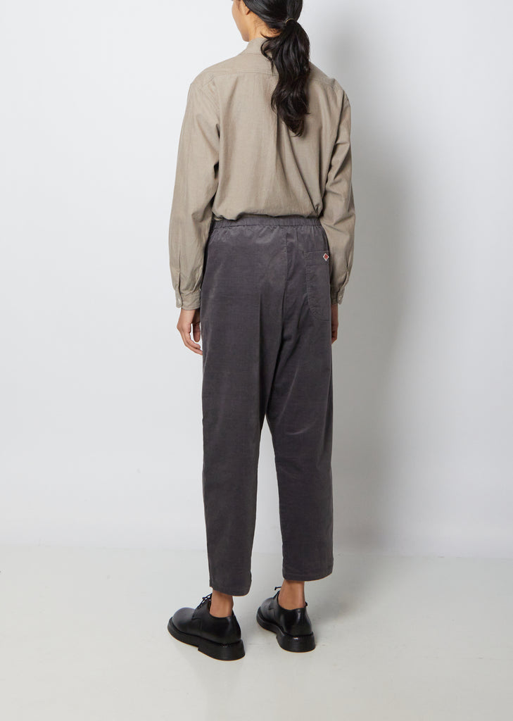 Danton high-waisted, taupe-grey, corduroy pull-on pants in a lightweight velvet cotton. Features an elasticized waistband with inner drawstring and double front side slit pockets with top stitching detail. Single back patch pocket with logo label. Tapered leg with a relaxed fit.