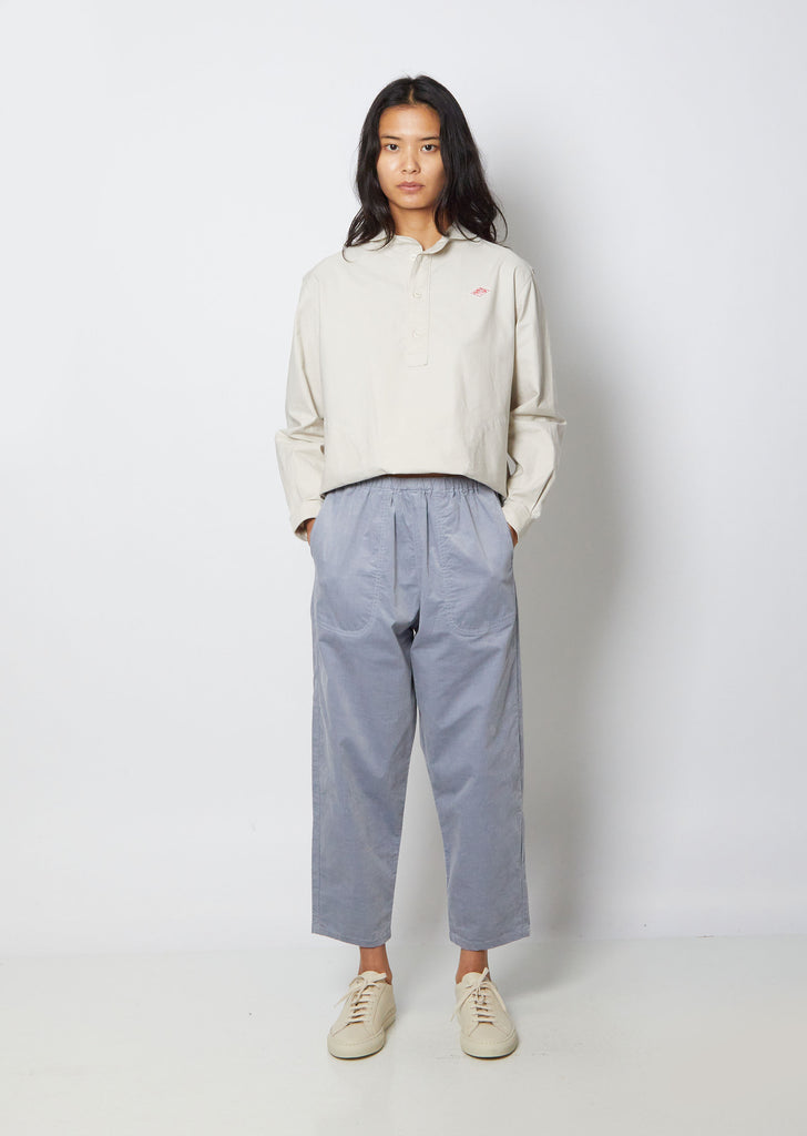 Danton high-waisted, grey-blue, corduroy pull-on pants in a lightweight velvet cotton. Features an elasticized waistband with inner drawstring and double front side slit pockets with top stitching detail. Single back patch pocket with logo label. Tapered leg with a relaxed fit.