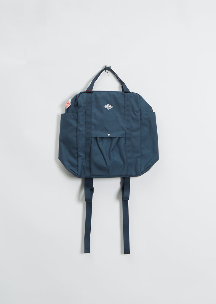 Danton smoky blue backpack in durable cotton canvas. Designed with slip side pockets and twin top handles for optional hand-carrying. Hand-dyed in Japan, this unisex accessory features Danton’s signature red-and-white logo appliqué at the front face.