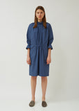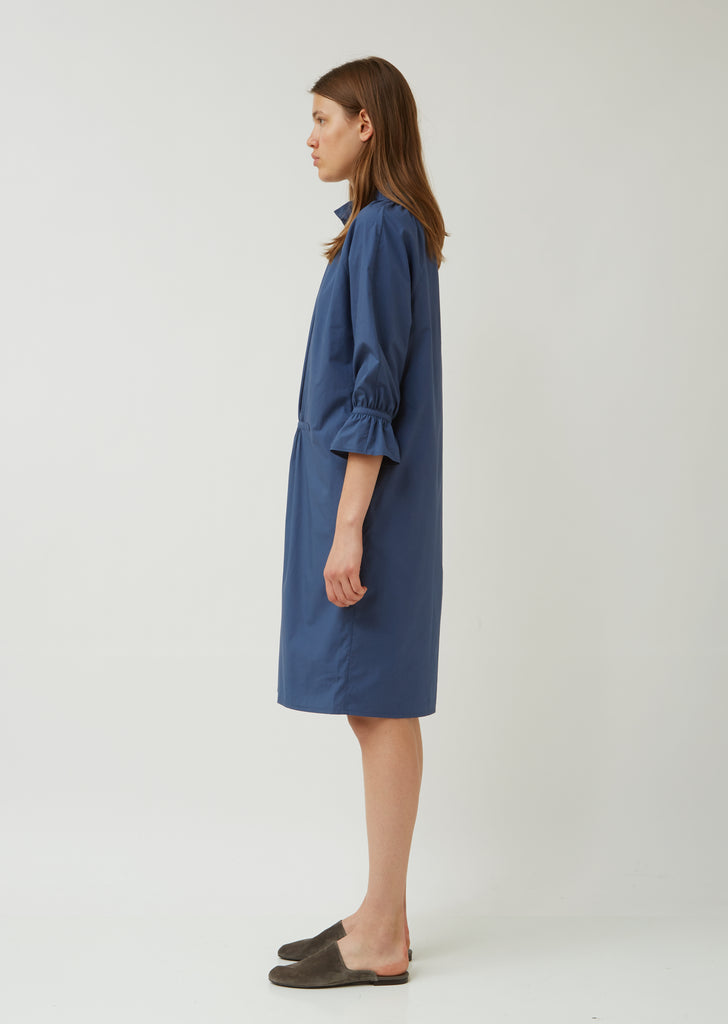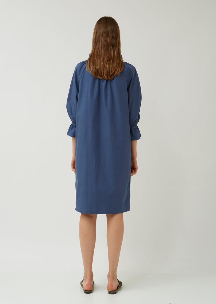 Slate-blue cotton sack dress with a ruffled stand collar and horizontal gathered darts at the waist. Raglan half-sleeves. Bell cuffs. Additional gathering at neckline. Straight knee-length hem. Relaxed fit.