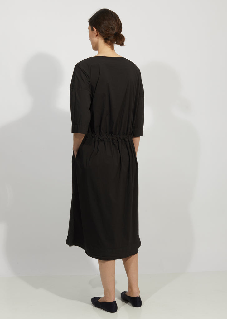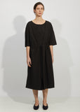 Black half-sleeve A-line dress in cotton broadcloth, designed with a draped front and a cased woven belt at the natural waist.
