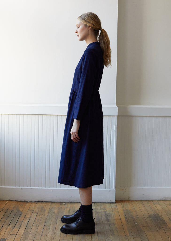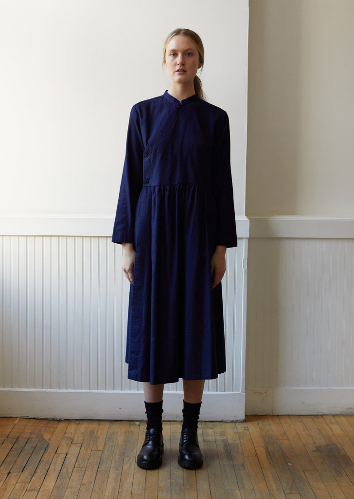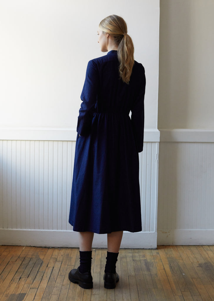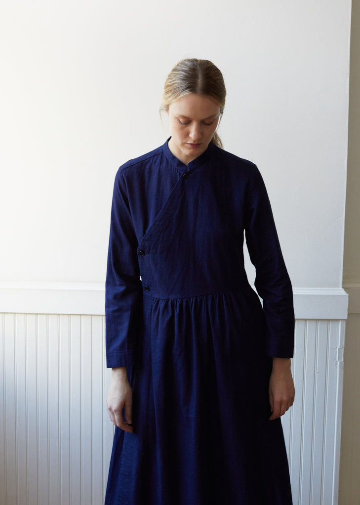 Midi-length bracelet-sleeve shirtdress in indigo-dyed cotton flannel, finished with a mandarin collar and an asymmetric three-button front closure. Tonal buttons. Seamed and gathered at natural waistline. Back shoulder yoke. Full skirt. Straight hem. Slightly A-line. Easy fit.