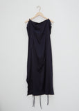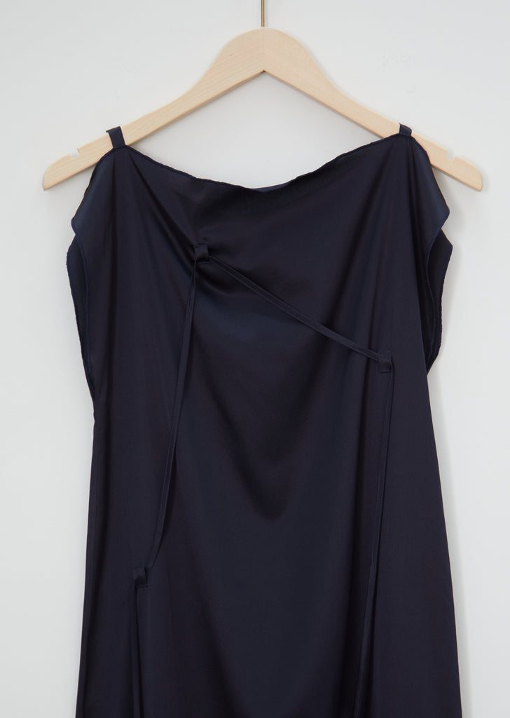Baserange Chey Silk Satin Dress in Navy. Slip dress with shoulder strap insets and a draped neckline featuring self straps that can be adjusted to tie around around the body, or wear loose.