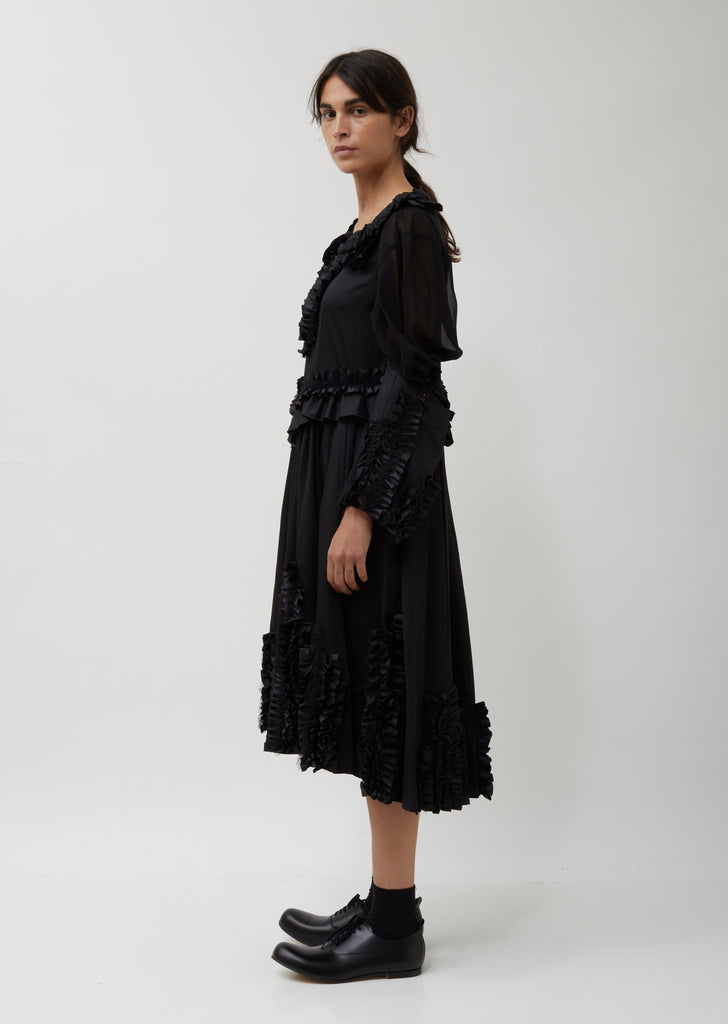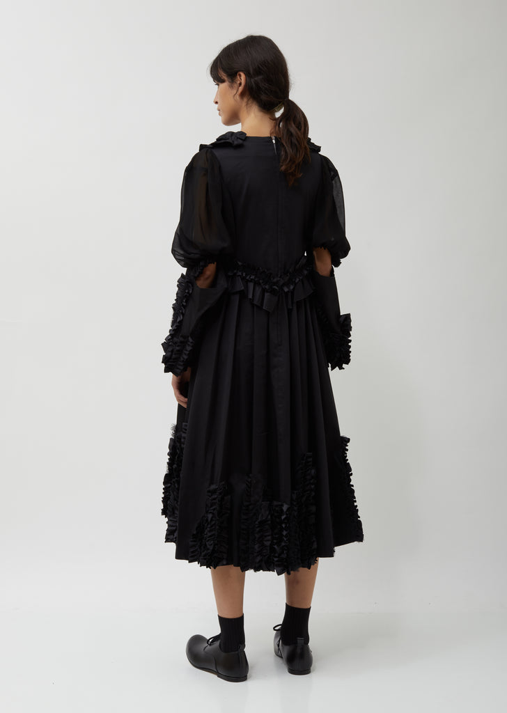 Black cotton A-line dress finished with tonal satin ruffle trim at the neckline, sleeves, waist, and skirt. Round neckline with bib front. Leg-of-mutton sleeves; puffed upper portion is crafted from sheer georgette. V'd waist. Gathered skirt. Concealed back zip fastening. Slight high-low hem. Classic fit.