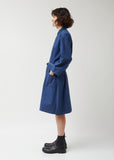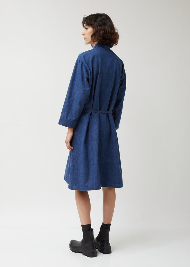 Knee-length long-sleeve shirtdress imagined in hand-finished medium-blue cotton denim. Classic collar. Wide bracelet sleeves. Snap-button front closure. Tonal buttons. Seamed at natural waist. Optional coordinating self-tie belt. Belt loops at sides. Angled patch front pockets at thigh. Straight hem. A-line silhouette when belted. Easy fit.