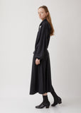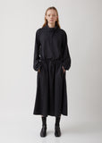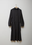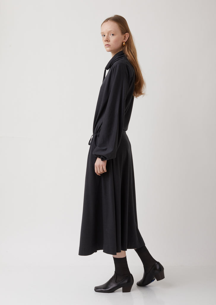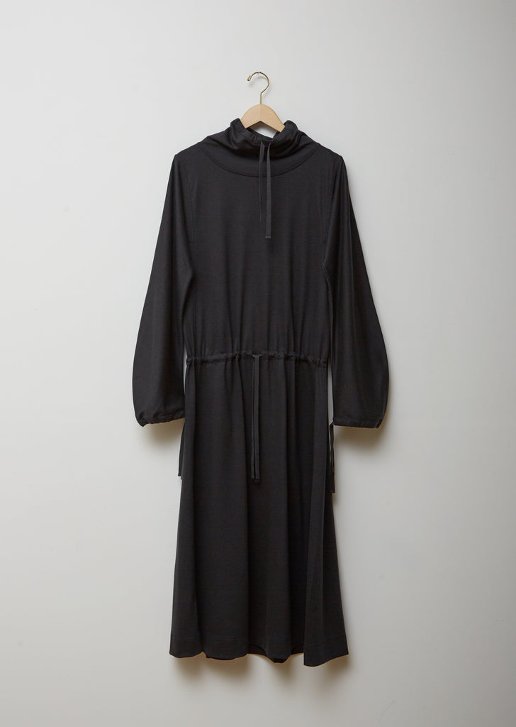 Anthracite wool-cotton-jersey midi dress with drawstring details at the neck, cuffs, and waist. Cowl neck. Long sleeves. Drop waist. Gathered elasticated drawstring waistband. Side slip pockets at hips. Straight hem. Loose A-line silhouette. Relaxed fit.