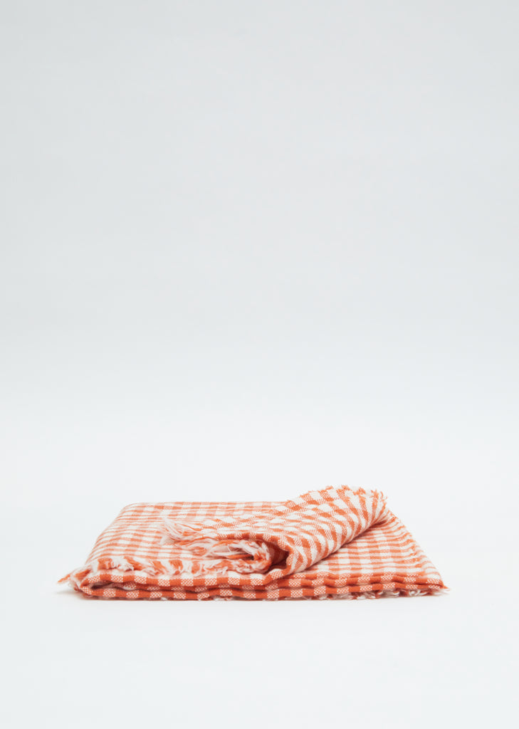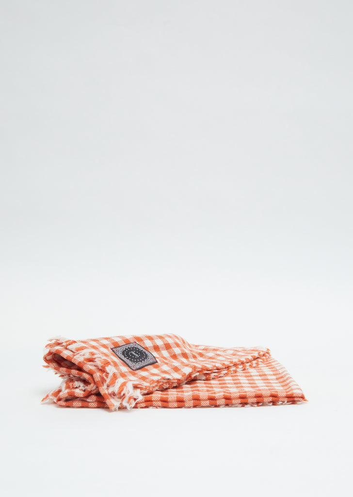 Destin orange and white check scarf in a lightweight wool, cashmere and silk blend. Fringe edge detailing with logo patch.