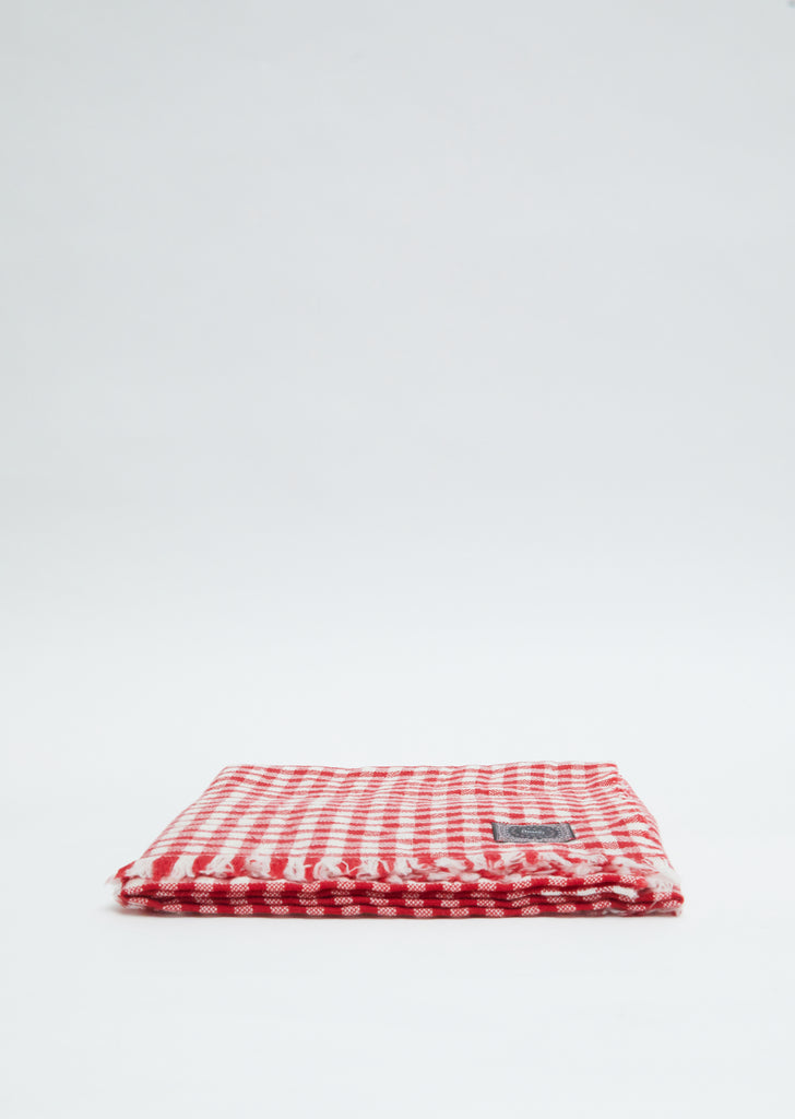 Destin cherry red and white check scarf in a lightweight wool, cashmere and silk blend. Fringe edge detailing with logo patch.