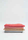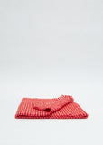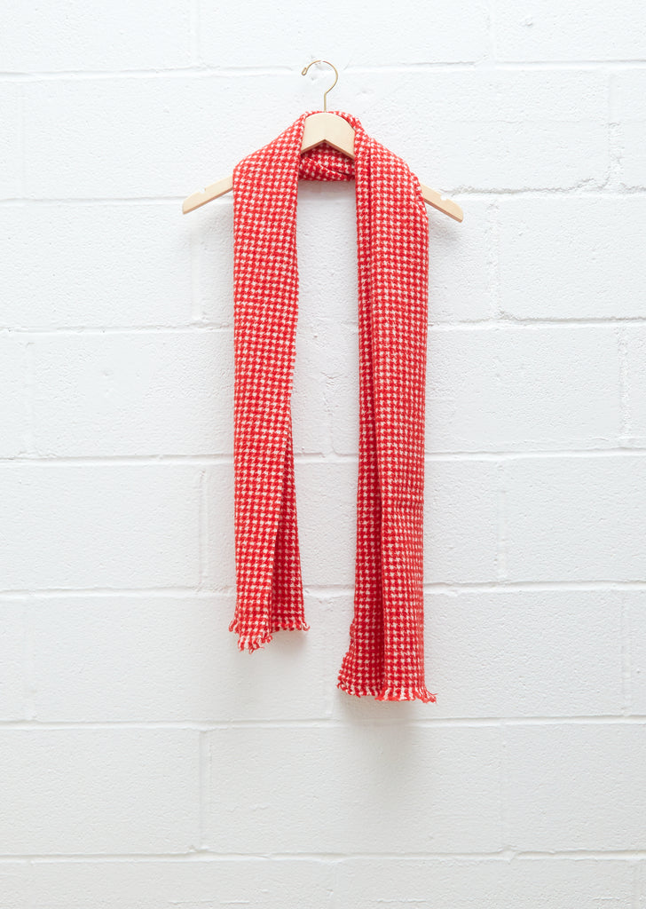 Destin red and white houndstooth scarf in a lightweight wool, cashmere and silk blend. Fringe edge detailing.