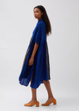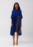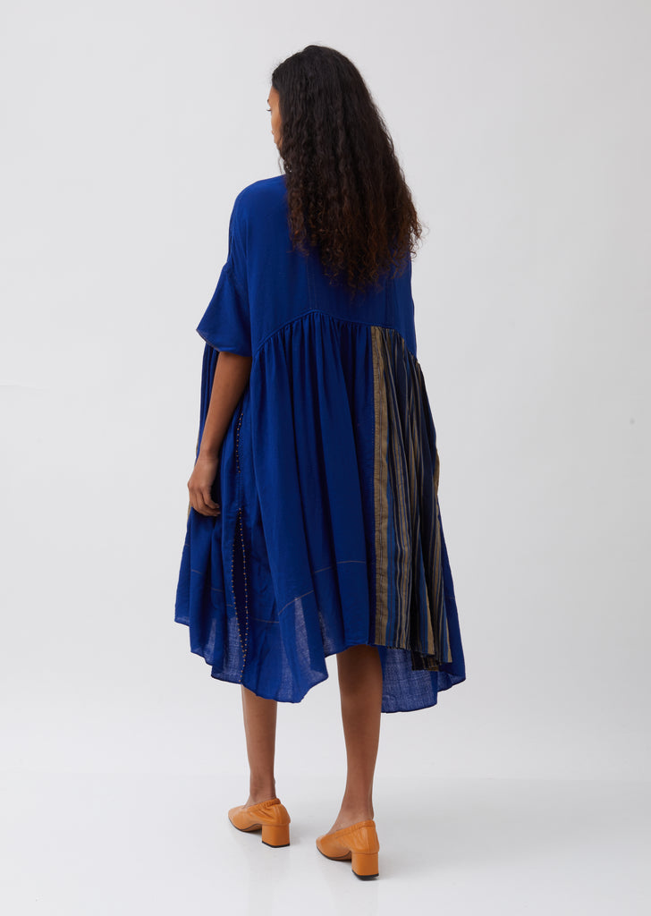 Plain-woven marine-blue wool-cotton shirtdress featuring a gathered skirt with sewn-in panels of blue-and-taupe Bengal stripes. Pulls over. Point collar. Three-button placket. Pick-stitching at collar and placket. Drop shoulders. Short bell sleeves with taupe trim. Curved empire waist. Curved hem. Trapeze silhouette. Relaxed fit.