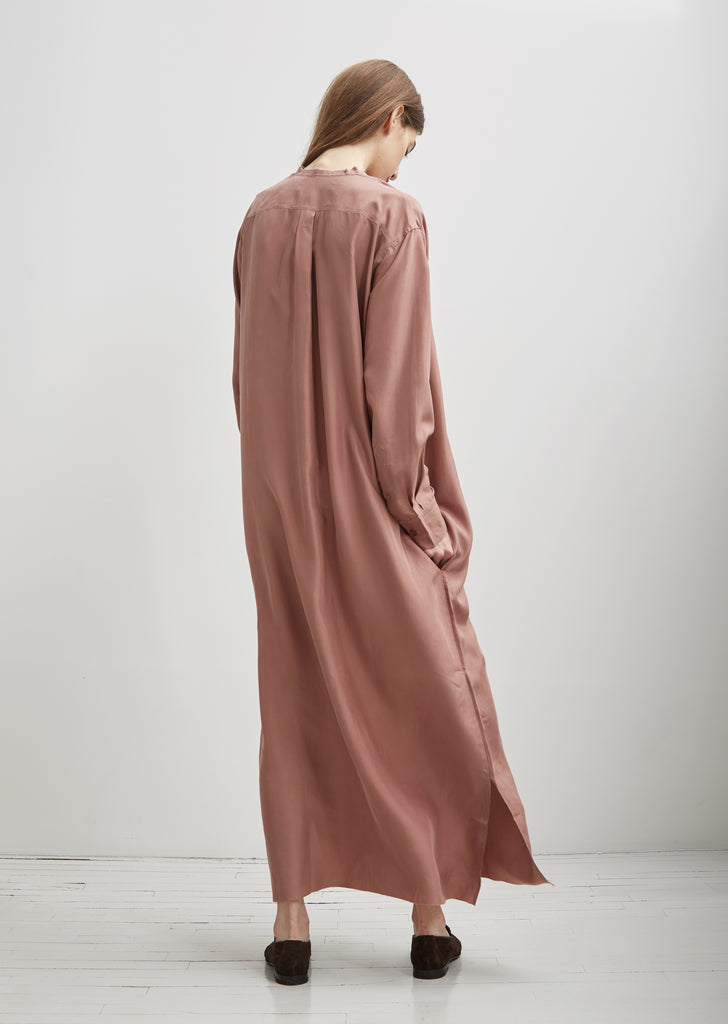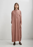 Mauve silk long sleeve tunic dress with raw edge neck trim in a washed silk habotai. Dropped shoulders. High side slits. Finished with tonal shell buttons down a half-placket. Oversized fit.
