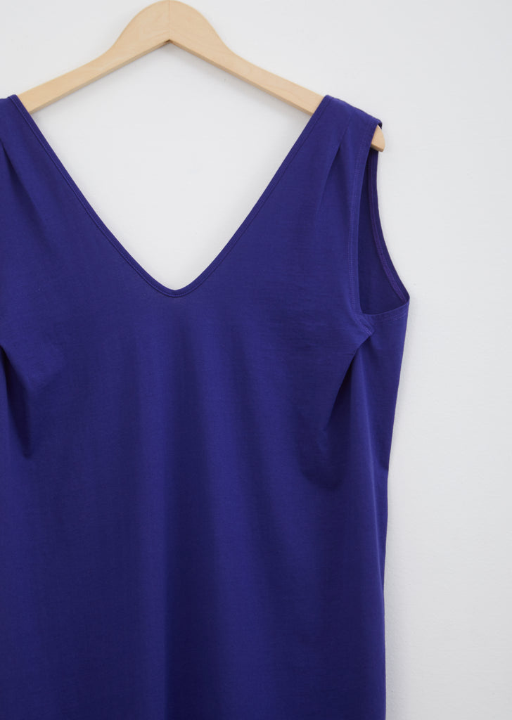 Forte Forte Mercerized Bio Cotton Dress in navy. Crafted in Italy with 100% mercerized cotton (which improves the strength of the fabric), this cotton dress has a tunic shape with a tuck detail at the lower armhole for shaping at the bust.  Features a soft -V-neck at front neckline, and a lower scoop back. Actual color is closer to purple as pictured.