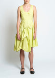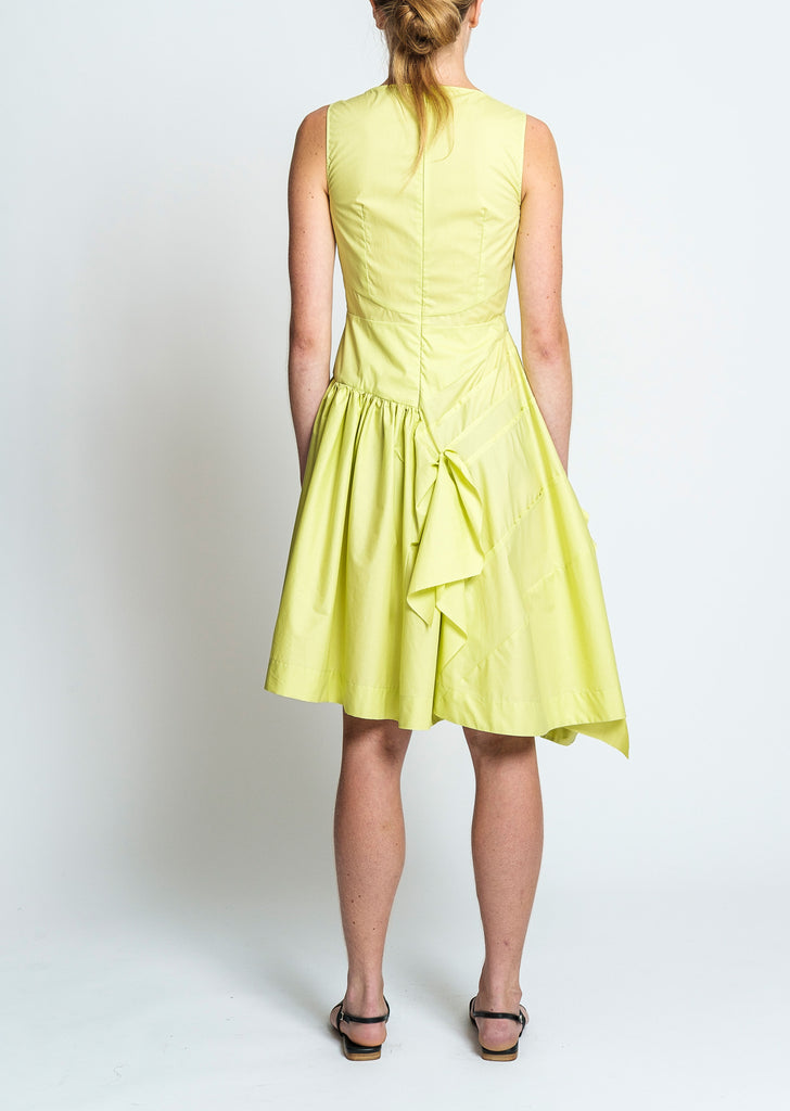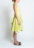 Molly Goddard Baldwin dress in a lime colored lightweight cotton with subtle sheen. This sleeveless dress features a paneled bodice with tuck detailing at center for subtle shaping, and a full skirt with ribbon detailing, paneling and ruching.