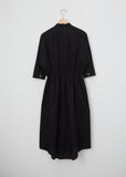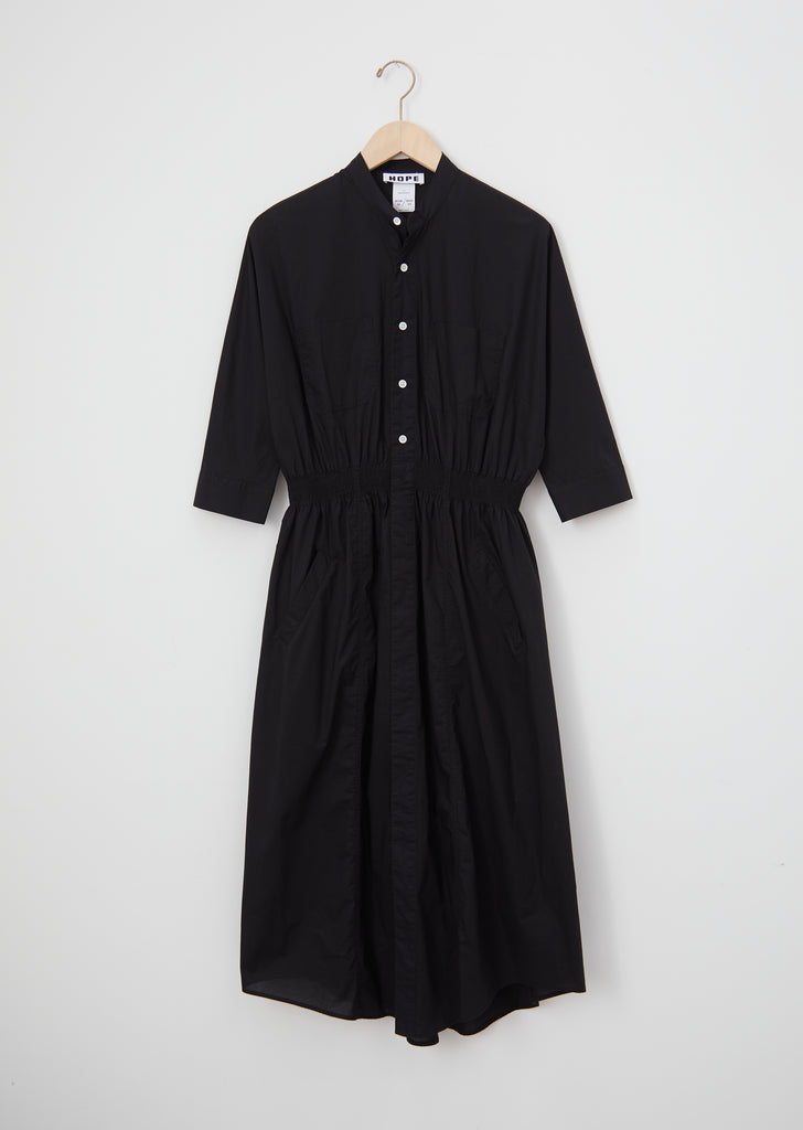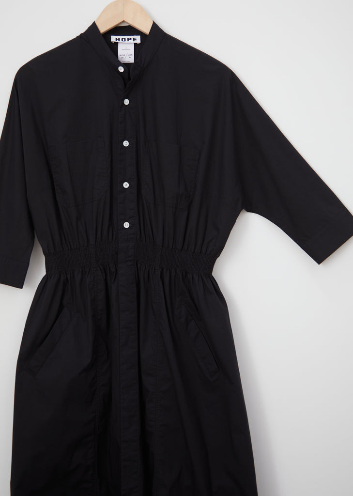 Hope Duo Dress in black. Crafted in cotton, this midi-length shirt dress with a mandarin collar features a cropped sleeve and elastic smock waist.