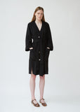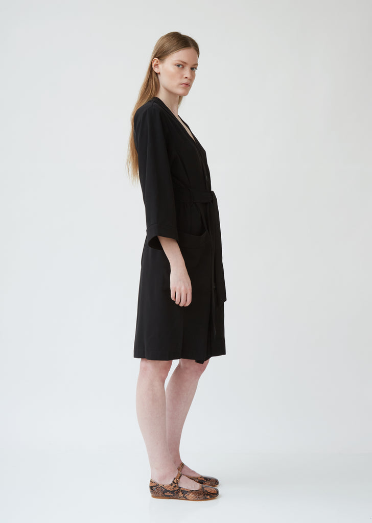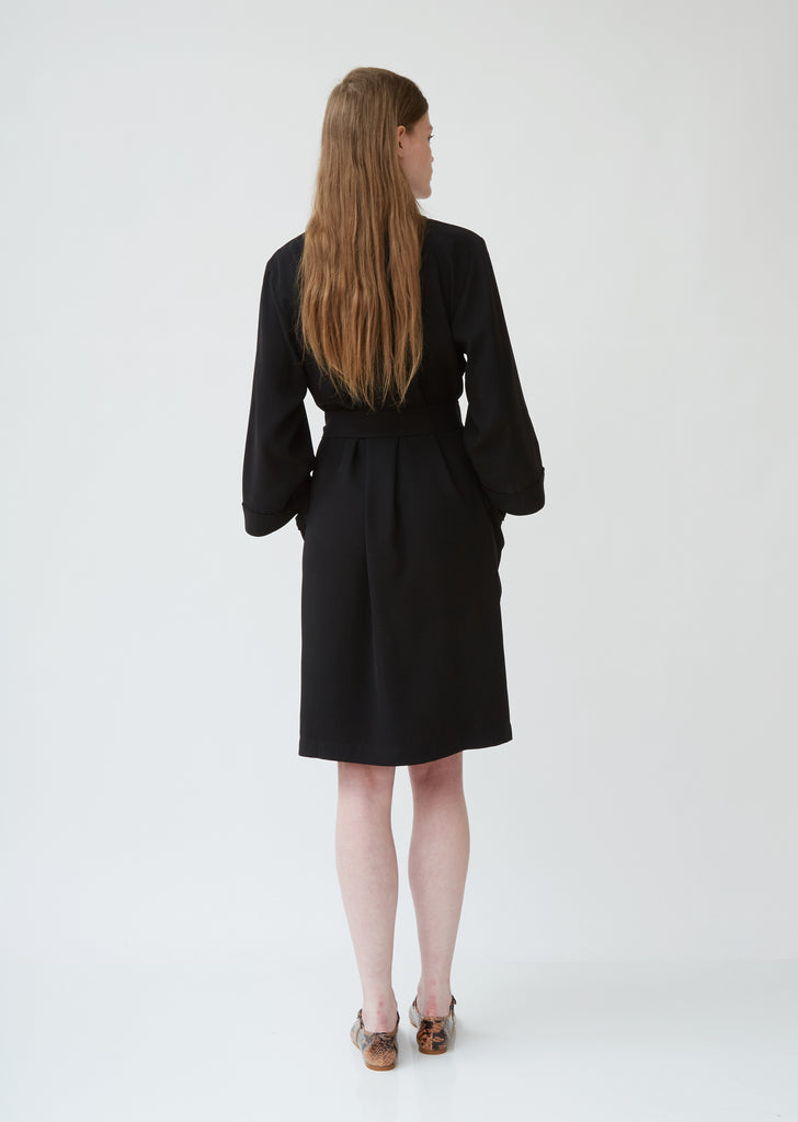 Subtle kimono and caftan references imbue this minimalist, everyday wrap-style dress. From HOPE, the Stockholm-based label that strives to create "tomorrow's classics," with a focus on responsibly produced staples and unisex silhouettes. Shawl collar. Four-button front. Sash belt; belt loops. 3/4-length cuffed sleeves. Collar-to-waist box pleat at back. Knee-length. Color: Black. 100% polyester. Machine wash. Imported.