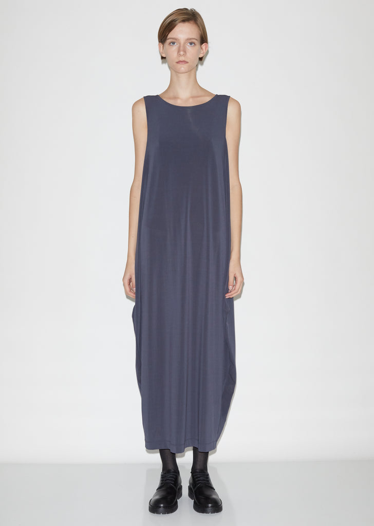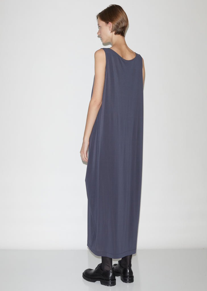 Sleeveless dark-grey jersey midi dress with a tapered, tulip-shaped skirt and fluid draping at the sides. Slips on. Round neckline. Straight hem; hits lower calf. Column silhouette. Relaxed fit.