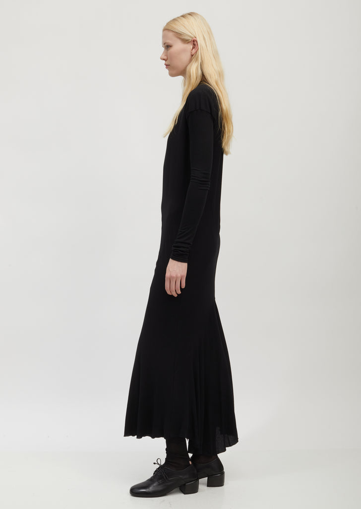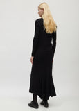 Black floor-length long-sleeved dress with a round neck and a zip fastening at the back. This dress’ bias cut design, slight ruching at the shoulders and gathered detail at the hem make for an exercise in restrained glamour.