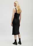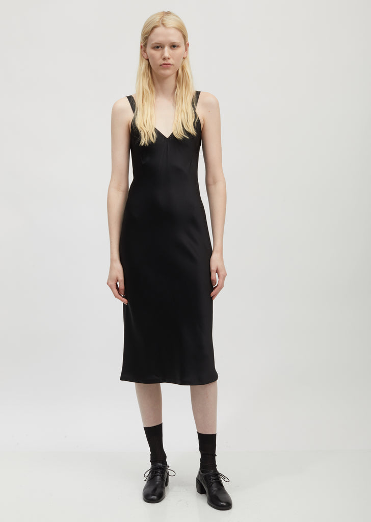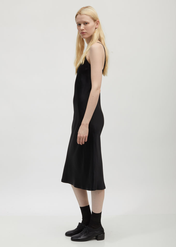 Black midi length camisole dress with a v-neck and wide shoulder straps. With a smooth feel and silk lining, it's the luxurious version of a wardrobe staple.